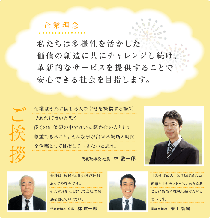 | 役員 | 代表取締役会長 林 貢一郎 代表取締役社長 林 敬一郎 常務取締役 東山 智樹 |